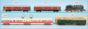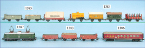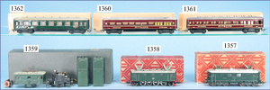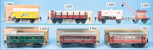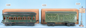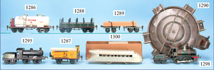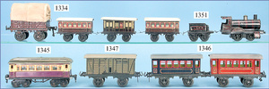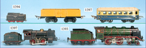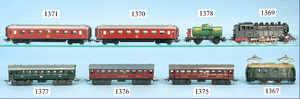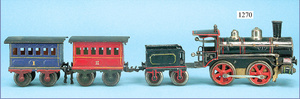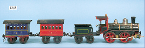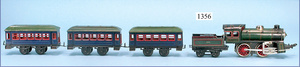 MÄRKLIN, Uralt, Spur I, Zug bestehend aus 1021BN, Uhrwerk, Schlepptenderlok B, schwarz/grün, nur vorwärts, mit Bremse, um 1900, 37 cm, dazu 2 Personenwagen, 1805, 12,5 cm, 1903 - 1906, blau, 1. Klasse, rot 2. Klasse, minim. Krakeleebildung am Dach, sonst sehr guter Zust., schöne Farben