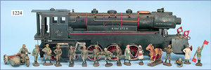 Dampflok 1C2, Bayerische Staatsbahn, Eigenbau, möglicherweise Schaufenster-Deko der Firma HAUSSER, HAUSSER-Schriftzug auf Seitenwand schwach erkennbar, Blech- u. Holzteile, Elektroantrieb, 59 cm, techn. nicht geprüft, dazu als Deko 14 ELASTOLIN u. LINEOL Soldaten, Masse, 7,5 cm, 1 Motorrad mit Beiwagen, stärker bespielt, altersbedingte Lackfehler