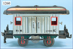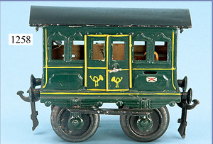 MÄRKLIN, Uralt, Spur I, 1821, Durchgangswagen, 20 cm, rot/braun, gotische Fenster, unten querliegender Gaszylinder, mit Inneneinrichtung, 2 Orig.-Figuren, sehr schöner Orig.-Zust., schöne Farben, Dachbodenfund aus herrschaftl. Haushalt, 1901 - 1905