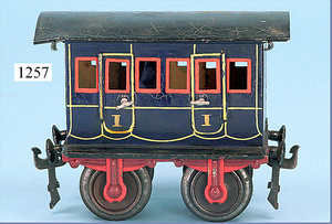 MÄRKLIN, Uralt, Spur I, 1806, Abteilwagen, 2A, 12,5 cm, limitierte Federachslager, lange Trittbretter, Inneneinrichtung, 1898 - 1906, dunkelblau, 1. Klasse, Krakeleebildung am Dach, sonst sehr schöner Orig.-Zust., 1 Figur, Dachbodenfund aus herrschaftl. Haushalt