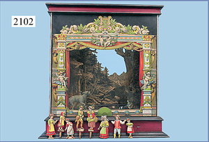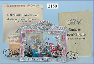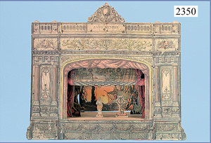 Papiertheater, 72 cm breit, 64 cm hoch, mit bewegl. Vorhang, Kulissenteile, Figuren, um 1900