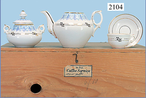 Puppenstuben-Geschirr, in Holzkiste, Kaffeeservice, 1 halbes Dutzend, weiß/blau/gold mit Noten, 6 Tassen, 6 Untertassen, Zuckerdose, mit Deckel, Kaffeekanne ohne Deckel, Milchkanne fehlt (n. a. T. f.)