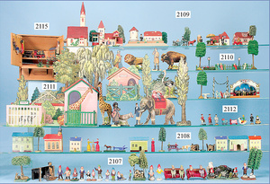 Zoologischer Garten, ausgefallene Papierarbeit, Pappe mit lithogr. Papier beklebt, 9 Gehegeteile, Tiere Figuren, Bäume, Zubehör, dekorativ, in alter Spanschachtel