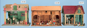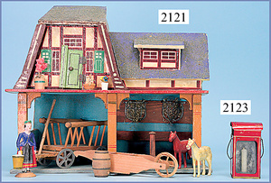 kl. Puppenstuben-Stall, Manufakturarbeit, um 1900, 36 cm, breit, 34 cm hoch, Leiterwagen, ERZGEBIRGE-Bäuerin, Tiere, 1 Leiste am Giebel fehlt, sonst sehr schöner Orig.-Zust., Orig.-Bemalung
