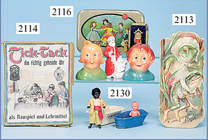 'Tick-Tack, die richtig gehende Uhr, als Bauspiel und Lehrspiel', Bausatz, Zeiger fehlen, auf Vollständigkeit nicht geprüft, schön bunt lithogr. Deckbild, Karton etwas verschlissen