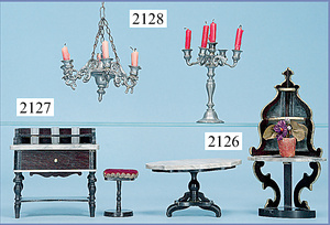 Puppenstuben-Eckregal, Biedermeier, 19 cm hoch, mit Marmorplatte, seitlich verspiegelt, Marmorplatte geklebt, sonst gut, dazu passend 1 Tisch, 12,5 cm lang