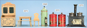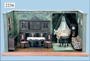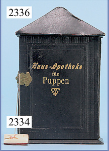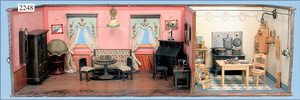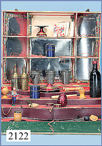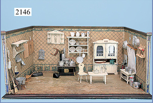 Puppenküche, 65 cm breit, 38 cm hoch, 34 cm tief, alte Tapete an Wand u. Boden, möbliert, mit reichhaltigem Zubehör, Porzellanteile, Gewürzdosen, Salz- u. Mehlmetze, ohne Deckel, Brettchen, ovale Brotdose, Blech lithogr., Holz-, Messing- u. Keramikteile
