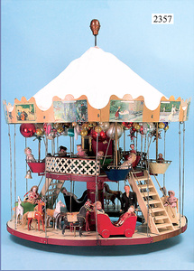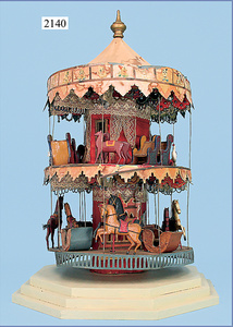 Puppenkarussell, Biedermeier, ca. 70 cm, mit Sockel 77 cm, unterer Sockel 1x ergänzt, Gondeln, Pferde, Schwäne, aufwendig gestaltete Decken, Stoff mit Spitze u. Perlenarbeit, mit lithogr. Papier beklebt, dekor., schöne Gr.
