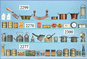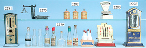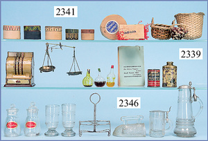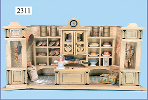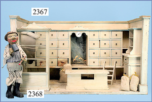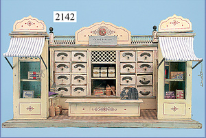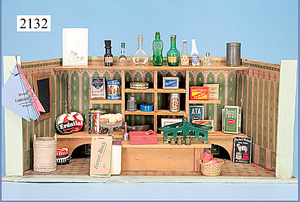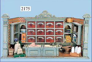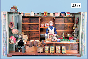 Kolonialwarenhandlung, 62 cm breit, 33 cm hoch, fest eingebaute Regale, nicht lackiert, Wände mit alter Bemalung, fest eingebauter Schrank, mit Theke, reichhaltig Zubehör, Dosen, Schachteln, kl. MÄRKLIN-Waage, Kart. der Waage vorhanden, 2 Stubenpuppen, 16 u. 25 cm