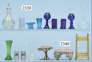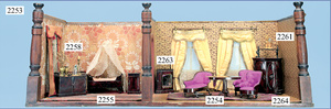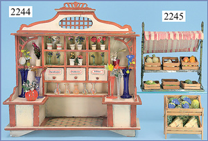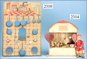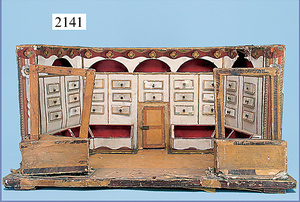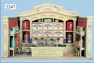 kl. Kaufladen, ausgehender Jugendstil, 53 cm breit, 23,5 cm hoch, Schubladen fehlen, Zubehör, teils alt, teils neuer, alte Tapete an Wand u. Boden, Gehäuse könnte auch als Stube umgestaltet werden