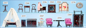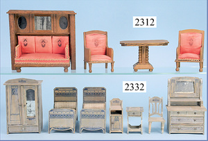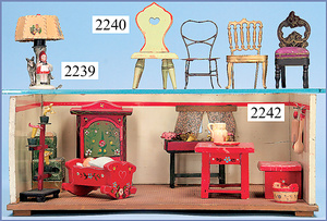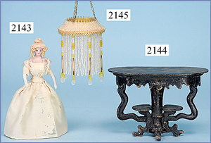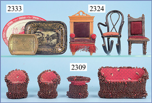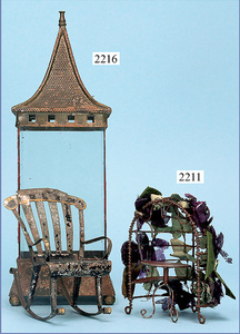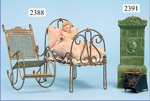 kl. Ganzbiskuit-Puppenstuben-Puppe, 8 cm, 1 Gitterbett, 15 cm, 1 Schaukelstuhl Blech
