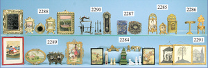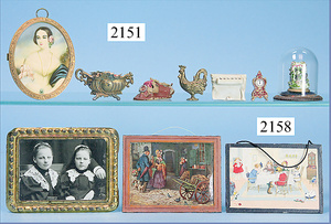 2 Puppenstuben-Bilder, bronzierter Zinnrahmen, 11 x 8,5 cm
