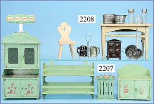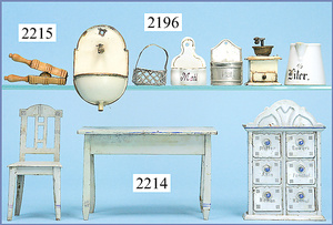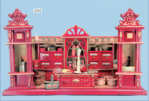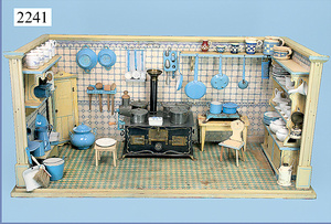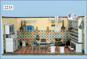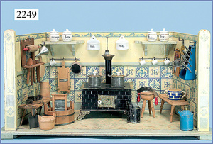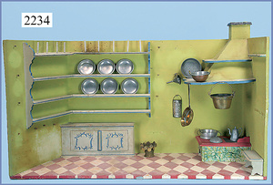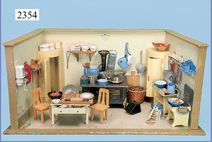 Puppenstuben-Küche, 92 cm breit, 43 cm hoch, ca. 1910, Bemalung etwas später, 2 fest eingebaute Schränke, Herd, 1 Tür am Herd fehlt, reichhaltig Zubehör, Wasserspüle, Teile Blech emailliert, Porzellanteile, Blechteile