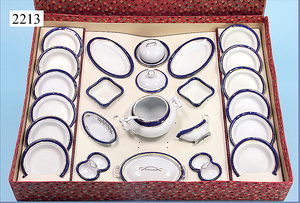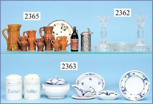 Puppenstuben-Speiseservice, Suppenschüssel, 6 cm, Sauciere, Salz u. Pfeffer, 6 teilw. unterschiedliche Teller, 2 Dosen mit Deckel