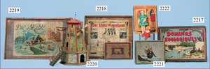 Zauberkasten, ca. 1870, 26,5 x 17,5 cm, Orig.-Kart. mit bunt lithogr. Deckbild, ohne Anleitung, wohl weitgehend kompl., auf Vollständigkeit nicht geprüft