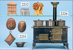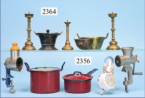 Konv. Puppenküchenteile, 4 Töpfe, Reiben, Fleischwolf, für Küche von mittl. - gr. Größe (n. a. T. f.)
