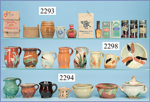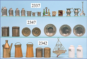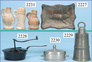 schönes Konv. Puppenküchenteile, 14 Keramikkrüge, 3,5 - 6 cm, 1 Bierkrug Zinn beschädigt, 1 Zwiebelkorb, 2 Wandteller Messing geprägt, 5 cm Durchm., Kuchenschale, Eierständer