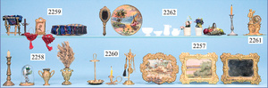 3 Teile Puppenstuben-Zubehör, Bild mit Zinnrahmen, 9,5 cm breit, Teller Messingblech vergoldet, 5 cm, 1 Bild mit Zinnrahmen 4 cm, 1 Tisch- Porzellanbild neuer, Limoges