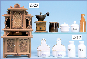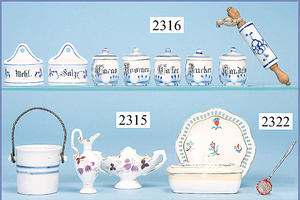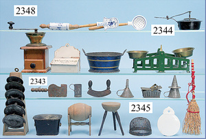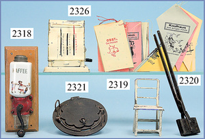 Konv. Puppenküchen-Zubehör, für gr. Küche, Kaffeemühle, Schublade fehlt, Deckel der Schublade vorhanden, 1 Henkelschale, Wichskasten, ein wenig Flugrost, 7 cm breit, Nudelrolle Porzellan, blau/weiß, 10,5 cm, 4 Teile Schöpfkelle, Sieb, Quirl, 1 Waage mit Messingschalen, Gewichtesatz