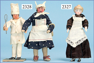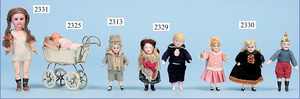 2 Teile Puppenstuben-Puppen, 8 u. 8,5 cm, fester Kopf, gemalte Augen, bewegl. Arme u. Beine, Orig.-Kleidung
