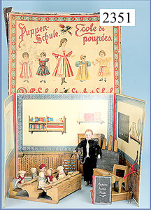 Puppenstuben-Schule, wohl Frankreich, Faltgehäuse, Orig.-Kart., Schulbänke, 6 Ganzbiskuitpuppen, Lehrer, Biskuitbrustblattkopf, -arme u. -beine, Stoffkörper, 17,5 cm, Höhe Seitenwände, 26 cm, Orig.-Kart., mit bunt lithogr. Deckbild,