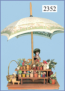 kl. Blumenmarktstand, älterer Eigenbau, 37 cm breit, Halbpuppe, reichhaltig Zubehör
