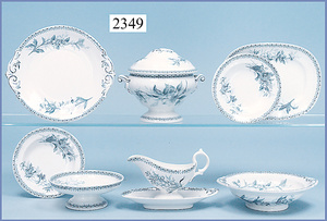 VILLEROY & BOCH, Wallerfangen, Kinder-Speiseservice, blaues Blumendekor, 5 flache Teller, 5 tiefe Teller, 11 cm Durchm., Sauciere, Suppenschüssel, Knauf am Deckel fehlt, 3 Schalen, Deckelschale, Deckel fehlt (n. a. T. f.)