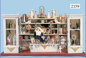 Kaufladen ohne Schubladen, eingerichtet als Sakral-Warengeschäft, mit Nonne, 67 cm breit, 34 cm hoch, mit reichhaltigem Zubehör, Blech, Porzellan, Engel, Engelsbilder, Wachsengel unter Glassturz, Zinnteile