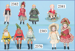 3 Puppenstuben-Puppen, Ganzbiskuit, 6 cm, Orig.-Kleidung, fester Kopf, bewegl. Arme u. Beine