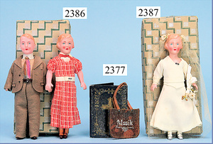 MINVERVA, 2 Puppenstuben-Puppen, Celluloid, Mann u. Frau, 14 cm, unbespielt, Orig.-Kart., Orig.-Kleidung
