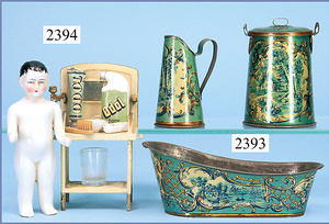 Puppenstuben-Badewanne, 15 cm, Blech, fein lithogr., Holländer-Motiv, dazu Wasserbehälter, mit Deckel, 1 Wasserkrug, sehr guter Zust.