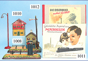 KRAUSS FANDOR Bahnhof, Blech lithogr., Grundplatte 10,5 x 8,5 cm, Eisenbahn-Fahrregler, Trafohaus mit Batteriekasten, Blech lithogr., sehr guter Zust.