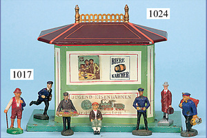 MÄRKLIN Landbahnhof, passend 0+I, Grundplatte 47 cm x 28 cm, Höhe 26 cm, mit Sitzgruppe und 3 Orig.-Figuren, Kartenhäuschen mit Zaun, 1 Fensterkreuz ergänzt, 1 Vordach neu befestigt, farbl. etwas ausgebessert, sonst guter Zust., mit Spielspuren