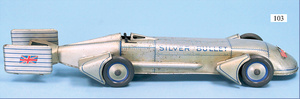 GÜNTHERMANN Rekordfahrzeug, Silver Bullet, Blech lithogr., 56 cm, Uhrwerkantrieb intakt, Bodenblech unter den Flügeln hinten ergänz, bespielt, kl. Stellen etwas Flugrost, sonst gut