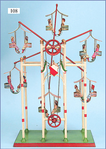 BING Riesenrad, Blech handlackiert, Dampfmaschinenantriebsmodell, 55 cm hoch, Grundplatte 31,5 x 21 cm, 6 Gondeln, wohl teilw. 1x farblich überarbeitet, 11 sitzende Massekinder (ELASTOLIN), 7 cm