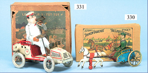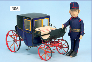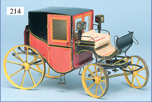 Kutsche, uralt, Blech handlackiert, handgelötet, 31,5 cm, im Schwarzbereich wohl farblich ausgebessert, sonst bis auf altersbedingte Lackfehler, guter Zust., mit Kutscher