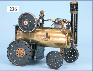 DOLL stationäres Lokomobil, Triebwerk auf liegendem Kessel, mit Kesselschürze, Wasserstandsglas, Orig.-Brenner, Schornstein, bespielter, guter Orig.-Zust., techn. Nicht geprüft