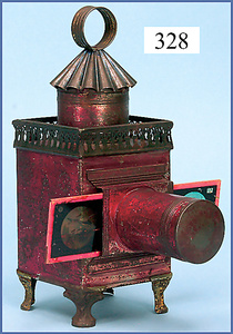 wohl ERNST PLANK Laterna Magica, 25 cm, mit Brenner u. Schornstein, Ersatzobjektiv, dazu 4 Orig.-Kart. Mit Glasplatten, dazu 1 alte Holzspielkiste,