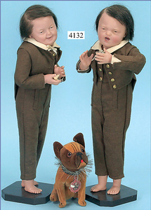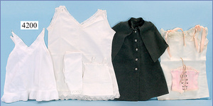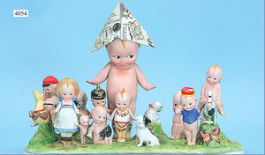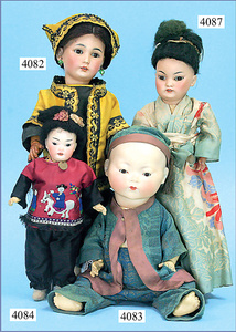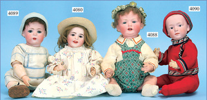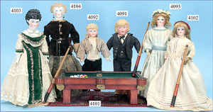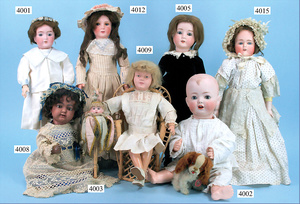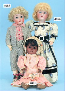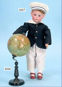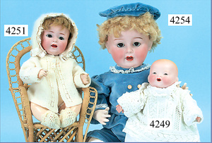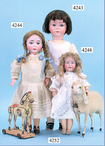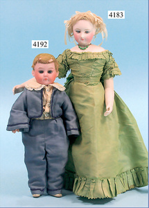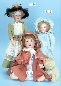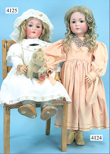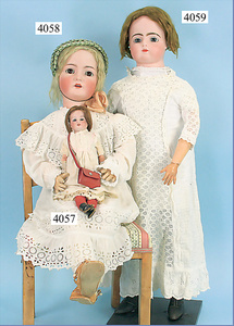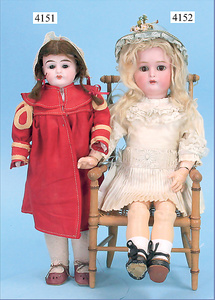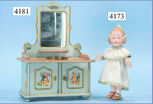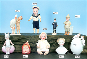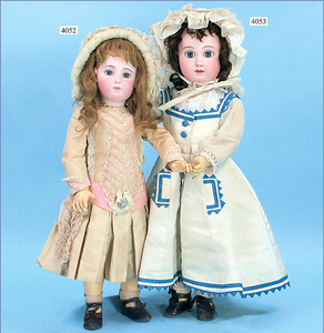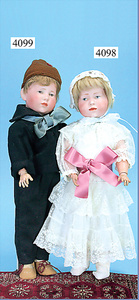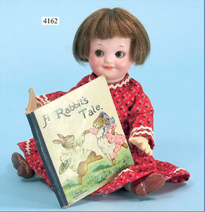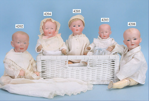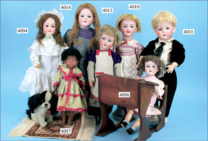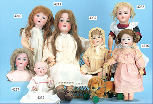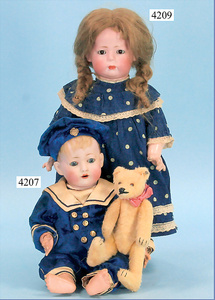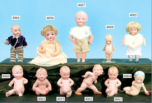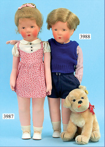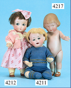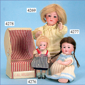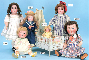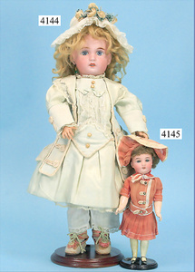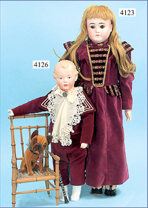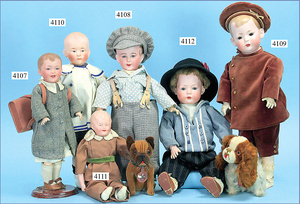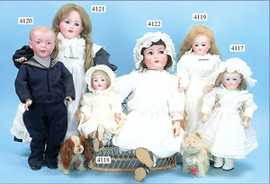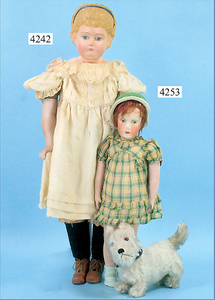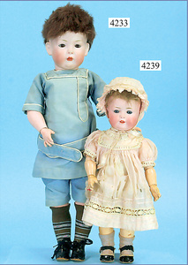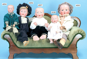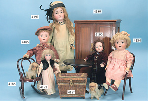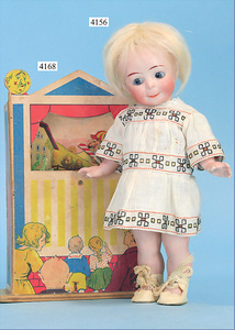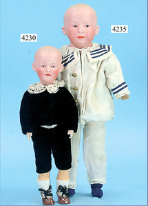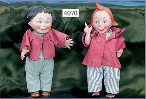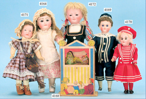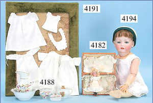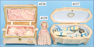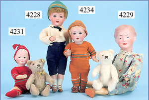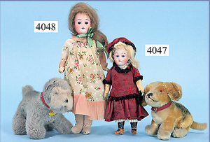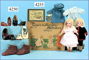 Puppenmütterchens Nähschule von Agnes Sucas, Orig.-Kart., ohne Anleitungsbuch, dazu 2 Ganzbiskuitpuppen, 25 cm, Mädchen mit blauen Schlafaugen, off. Mund, Zähne, Gliederkörper, mit festen Handgelenken, schöner Orig.-Zust., Junge, braune nachträglich fest eingesetzte Glasaugen, off. Mund, Zähne, Ausbruch am Kopf vorne geklebt, Gliederkörper mit festen Handgelenken, reichhaltig Kleidungsstücke