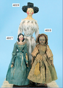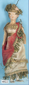 museale Holzpuppe, 18. Jahrhundert, 28 cm, Kopf Holz/Masse, altersbedingt Rissbildung, einige Masseabplatzer, fest eingesetzte Glasaugen, leicht off./geschl. Mund, bemalte Haare, Holzkörper, bemalte Beine, locker mit Haken befestigte Arme, mit männlichen Genitalien, Orig.-Kleid, Seide verschlissen, Orig.-Unterkleid, mit Haube, museal, absolut selten