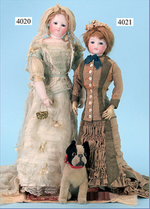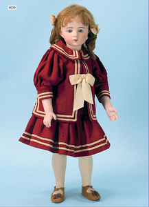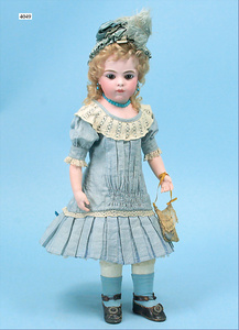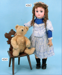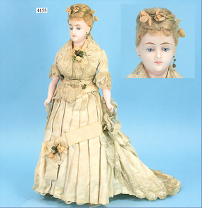 STEINER Biskuitporzellankopf-Puppe Frankreich, Figure C Paris, 70 cm, gepresster Biskuitkopf, gr. blaue fest eingesetzte Glasaugen, geschl. Mund, durchst. Ohren, außergew. stark ausmodellierte naturgetreue Ohren, leicht lächelnder Gesichtsausdruck, orig.-ausgeformter franz. Gliederkörper, Orig.-Papiermaché-Kopfdeckel, mit Echthaarperücke, schöne Gr., 1 Puppe mit besonderem Ausdruck, Orig.-Schuhe u. Strümpfe, altes franz. Kleid