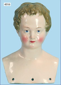 MEISSEN außergew. Puppen-Brustblattkopf, Junge, Brustblatt 8,5 cm, 11 cm insges. hoch, stark ausmodellierte Haare, ausmodellierte Ohren, blaue gemalte Augen, geschl. Mund, innen signiert, ein wenig Ofenstaubeinschlüsse, absolut selten, ca. 1860
