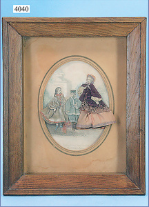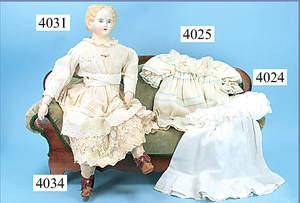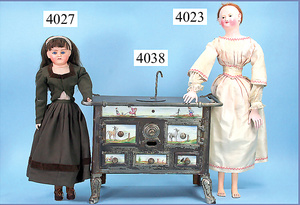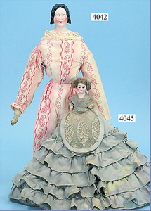 Biedermeierpuppe, ca. 1820, 33 cm, Papiermaché-Brustblattkopf, mit stark ausmodellierten Haaren, Zopf hinten, sowie seitlich, geschl. Mund, gegliederter Holzkörper, 1 Bein am Gelenk lose, Orig.-Seidenkleid, Orig.-Unterkleid, Seide altersbedingt verschlissen, sehr schöner Orig.-Zust., museal, schöne Gr. für 1 frühe gr. Rauchfangküche