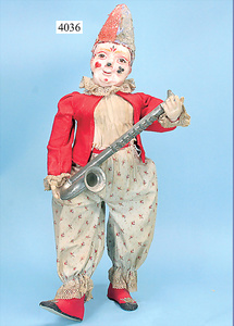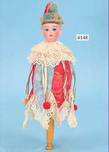 Marotte mit Musik-Drehmechanismus, Biskuit-Einbindekopf, blaue fest eingesetzte Glasaugen, off. Mund, oben Zähne, Griff Holz gedreht, als Flöte, 32 cm, Musikwerk intakt
