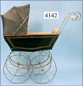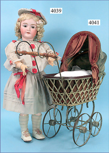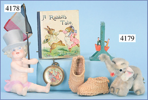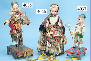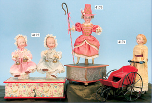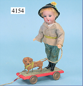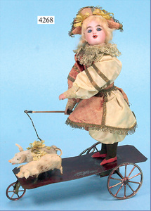 Automat, Frankreich, 22 cm lang, Guss-Speichenräder, 2 Fellschweine, Puppe Biskuitkopf, blaue Glasaugen, off. Mund, Zähne, Puppe bewegt den Kopf, den Arm, sowie den Fuß, Orig.-Seidenkleidung, mit nur kl. verschlissenen Stellen