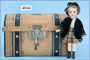 KESTNER 167, Biskuitporzellankopf-Puppe, 54 cm, braune Schlafaugen, off. Mund, Zähne u. Zunge, Kinngrübchen, Orig.-Mohairperücke, Gipsdeckel wurde nicht entfernt, von außen keine Risse erkennbar