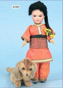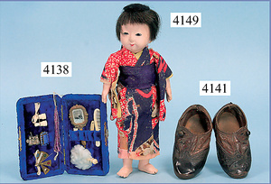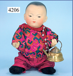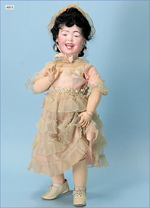 Googly, gemarkt 401, Ganzbiskuit, 12 cm braune seitlich blickende Glasaugen, geschl. Melonenmund, Biskuitarme u. -beine, anmodellierte Schuhe u. Strümpfe, schöne Orig.-Kleidung