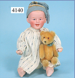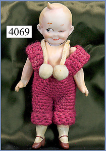 BAEHR & PROESCHILD kl. Charakterpuppe, ca. 1914, 602, Biskuitkurbelkopf, blaue Schlafaugen, off. Mund, oben anmodellierte Zähne, ausgeformter Sitzbabykörper, Perücke neuer, 17 cm