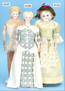 AM, Austria 1904, Biskuitporzellankopf-Puppe, 47 cm, braune Schlafaugen, off. Mund, oben Zähne, Hände ergänzt, alte Kleidung, alte Perücke, Kopf an 2 Stellen geklebt, vorne unter der Perücke, sowie hinten