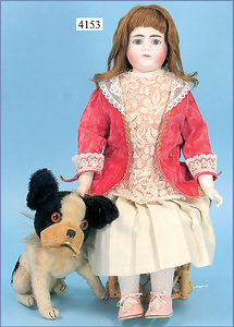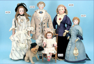 SIMON & HALBIG 1279, ausdrucksstarke Biskuitporzellankopf-Puppe, 52 cm, blaue nachträglich fest eingesetzte Glasaugen, off. Mund, oben Zähne, Kinngrübchen, durchst. Ohren, Puppe hat einen leichten Silberblick, ausgeformter Gliederkörper, Finger etwas berieben, alte Perücke, alte Kleidung u. Schuhe